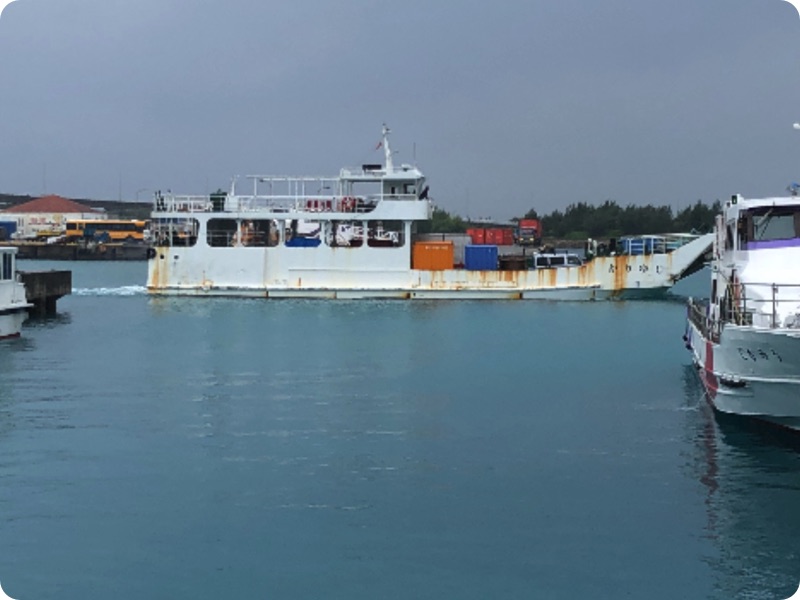そして、11時につくはずの船は30分遅れのはずと港にいくと、タイミングよく単管パイプがおろされていた。