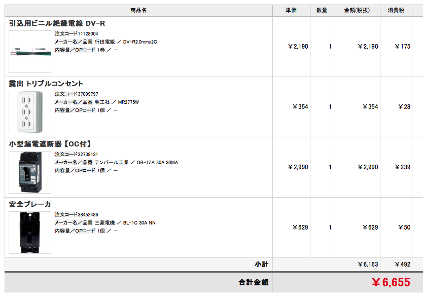 仮設電気用の材料一式を注文。