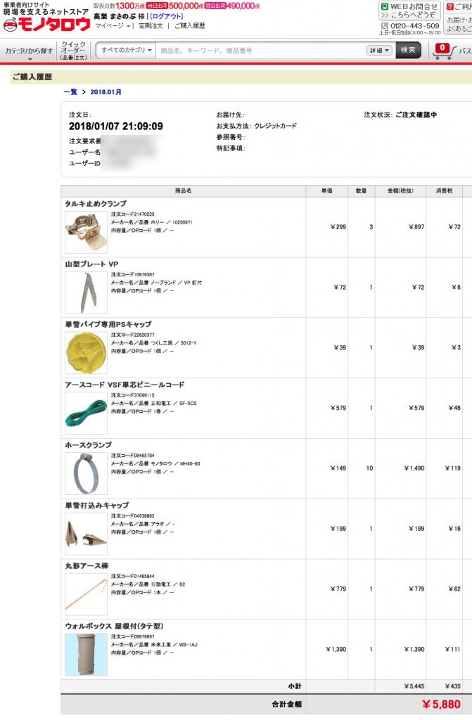 このほかに単管パイプ6mどぶ漬けが3,000円くらい(KMAX)。