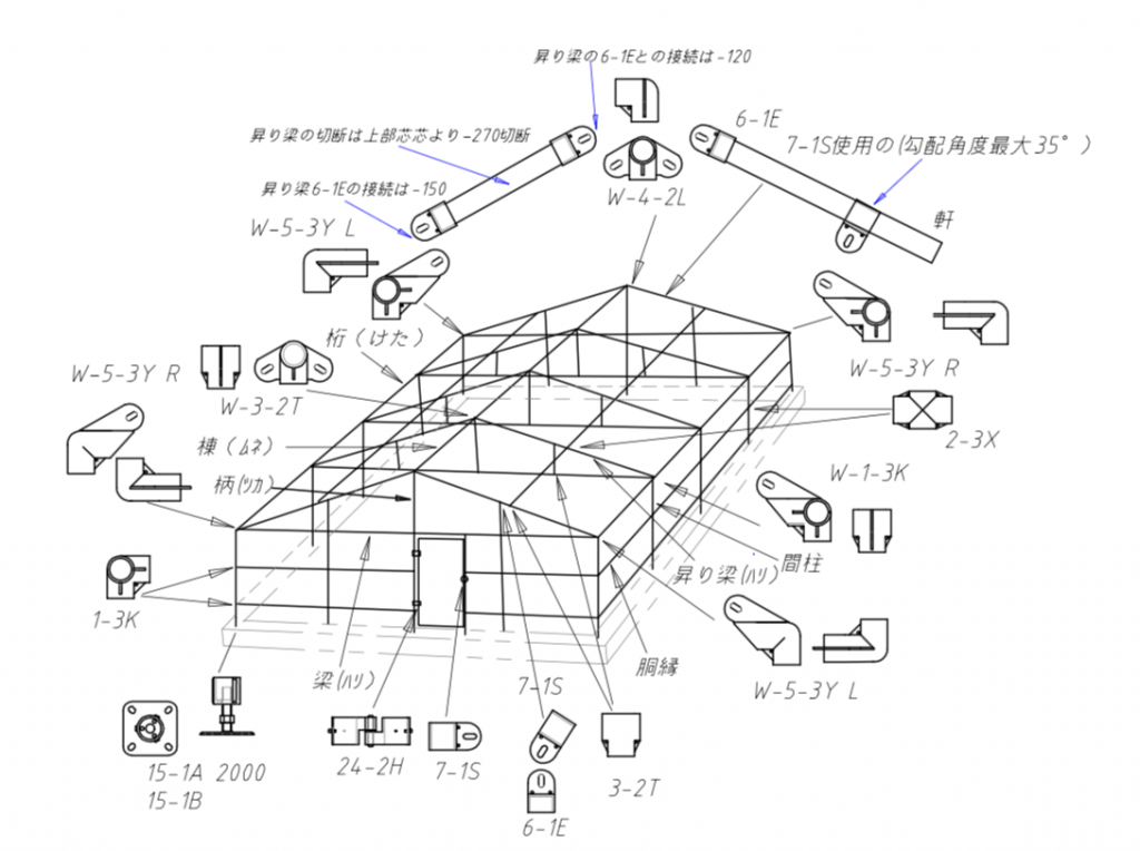 単管パイプが一番安くあがるはずなので考えているが、単管を接続する作業が、ちょっと問題があり、木造のようにピタッとくっつけることができない。ずれてしまう。こんな感じ。